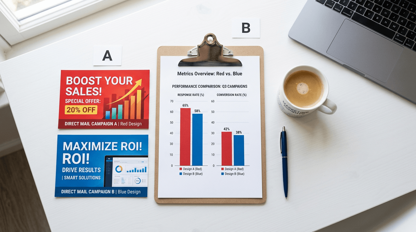 We create two design variants, split your mailing list, assign unique tracking to each variant, and measure response rates to identify the winner.